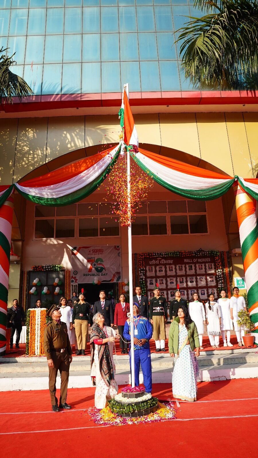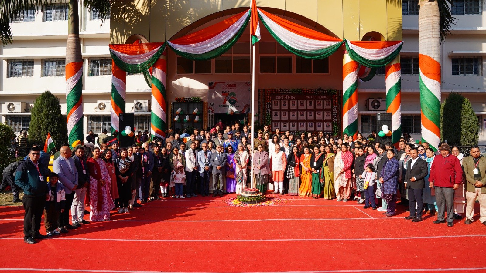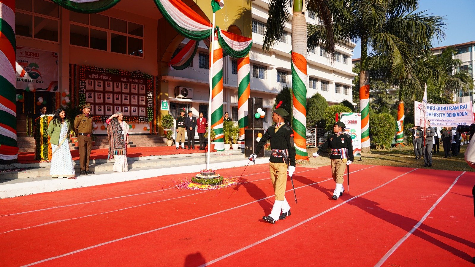 देहरादून। श्री गुरु राम राय विश्वविद्यालय (एसजीआरआरयू) सहित एसजीआरआर गुप के संस्थानों में गणतन्त्र दिवस समारोह धूमधाम के साथ मनाया गया। श्री दरबार साहिब श्री गुरु राम राय विश्वविद्यालय सहित एसजीआरआर के विभिन्न संस्थानों में गणतन्त्र दिवस पर मनमोहक कार्यक्रम आयोजित किए गए। श्री गुरु राम राय विश्वविद्यालय के एनएसएस, एनसीसी कैडेट्स, एनसीसी छात्र.छात्राओं सहित विश्वविद्यालय के 11 संघटक स्कूलों के छात्र.छात्राओं ने अनुशासित परेड से सबका मन मोह लिया।