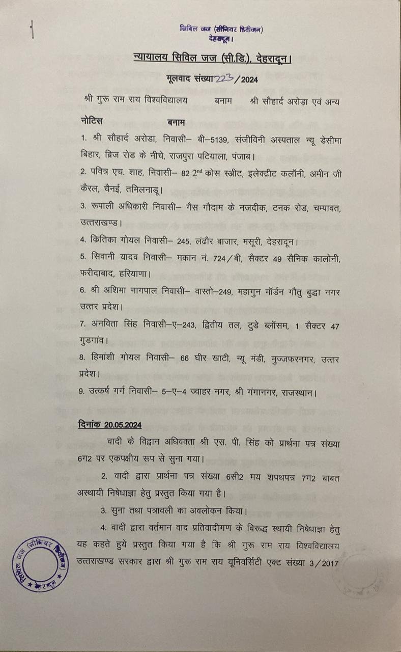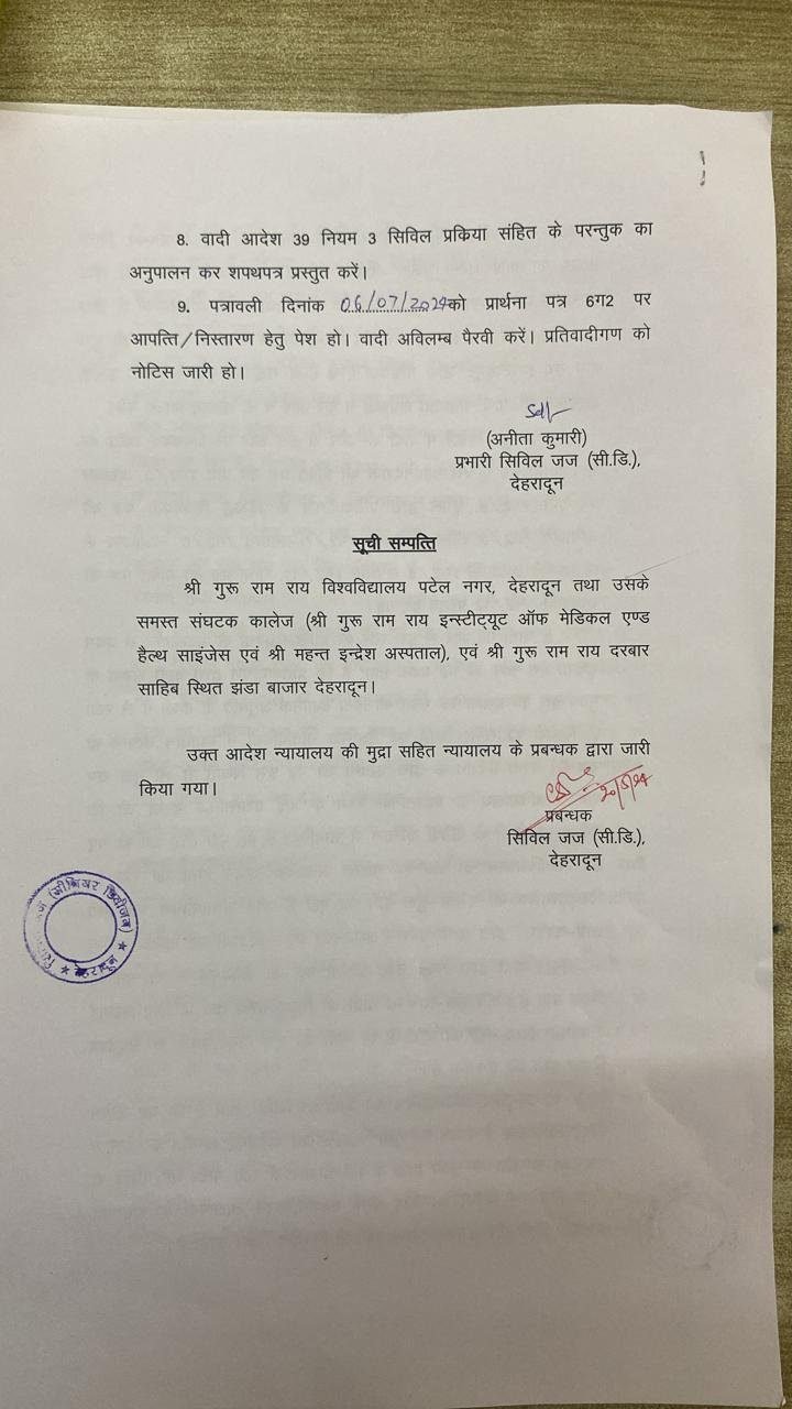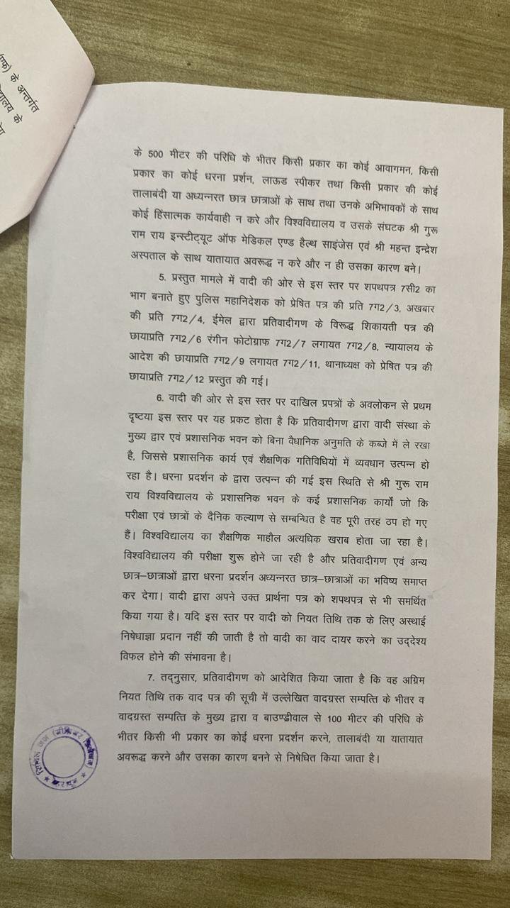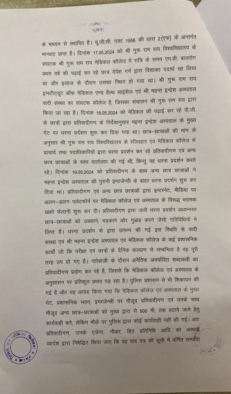 देहरादून। श्री गुरु राम राय इंस्टीट्यूट एवं श्री महंत इन्दिरेश अस्पताल परिसर में धरना प्रदर्शन कर रहे मेडिकल काॅलेज के छात्रों के विरूद्ध कोर्ट ने सख्त आदेश दिए हैं। मेडिकल काॅलेज, श्री महंत इन्दिरेश अस्पताल सहित श्री गुरु राम राय विश्वविद्यालय के सभी संघटक काॅलेजों के परिसर में किसी भी प्रकार का धरना प्रदर्शन पूर्णतः निषेध रहेगा। कोई भी छात्र छात्रा या असमाजिक तत्व अस्पताल, मेडिकल काॅलेज की सेवाओं को बाधित नहीं करेगा। इससे उपचार के लिए आने वाले मरीजों को बड़ी राहत मिलेगी और किसी भी मरीज़ के उपचार में व्यवधान उत्पन नहीं होगा। साथ ही साथ किसी भी जूनियर छात्र-छात्रा को क्लास में जाने व अध्ययन करने से नहीं रोका जाएगा।