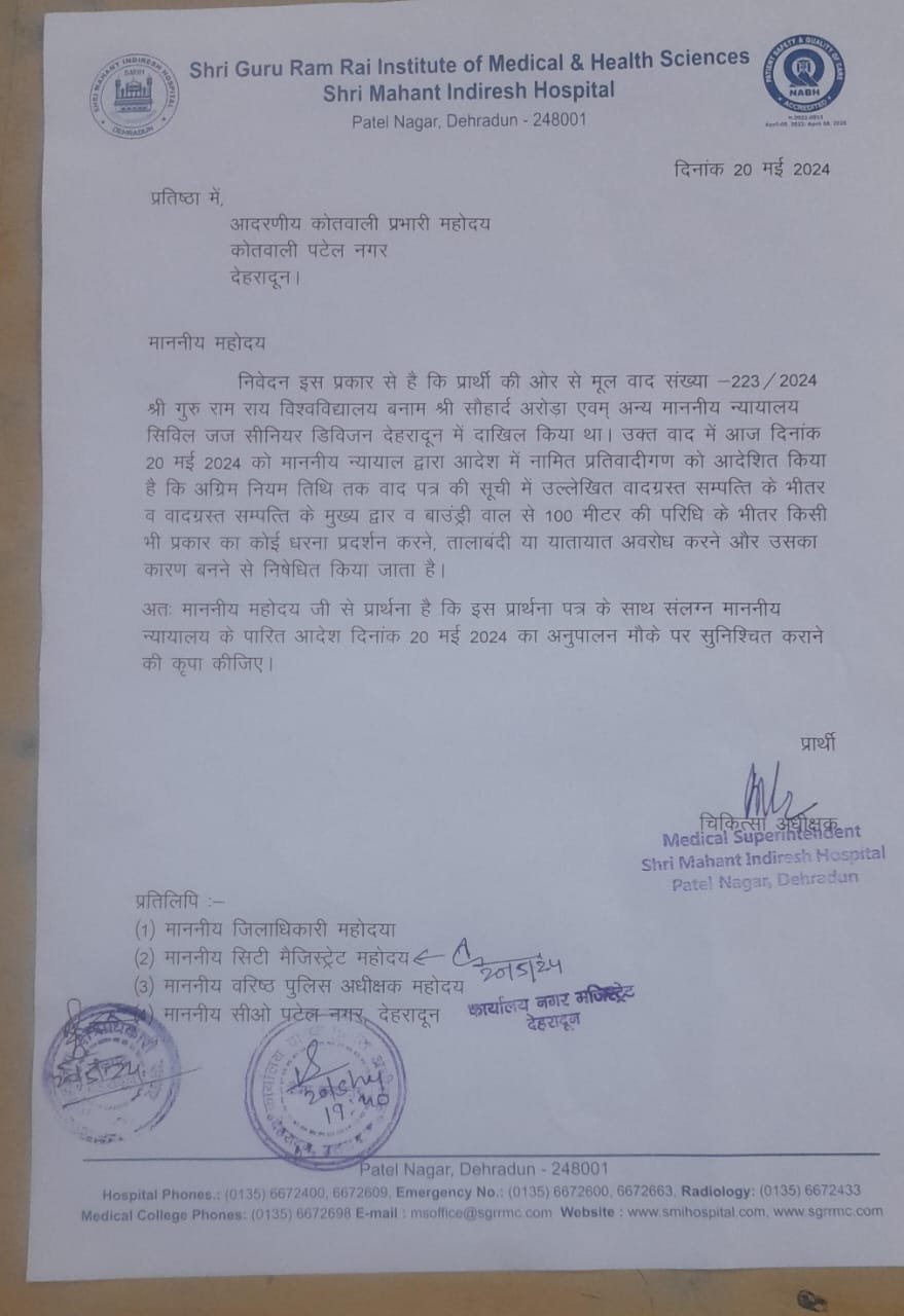 श्री गुरु राम राय इंस्टीट्यूट ऑफ मेडिकल एण्ड हैल्थ साइंसेज़ के वरिष्ठ अधिवक्ता एडवोकेट एसपी सिंह ने जानकारी दी कि कोर्ट के आदेश के अनुसार अस्पताल परिसर व मेडिकल काॅलेज परिसर में शांति भंग, नारेबाजी पर पूर्णतः रोक रहेगी। कोई भी व्यक्ति या छात्र अस्पताल के यातायात को बाधित नहीं करेगा। पुलिस ने छात्र-छात्राओं को समझाते हुए कड़ी चेतावनी भी दी है कि यदि अस्पताल परिसर व मेडिकल काॅलेज में किसी प्रकार की अनुशासनहीनता की गई तो सुसंगत धाराओं में मुकदमा दर्ज कर कानूनी कार्रवाई की जाएगी।
