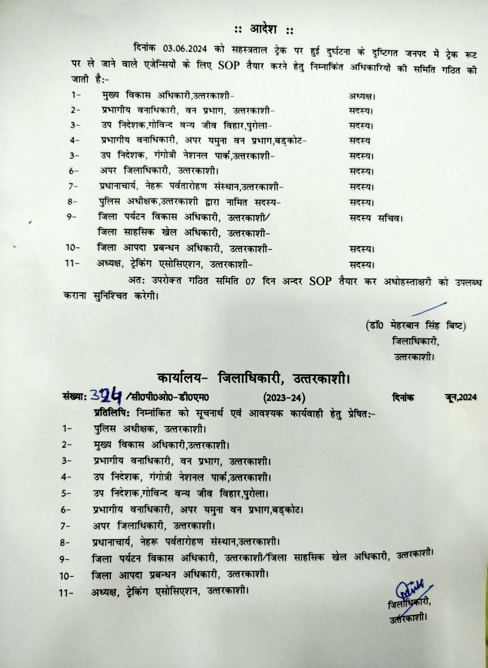 उत्तरकाशी : सहस्त्रताल ट्रेक पर हुई दुर्घटना के दृष्टिगत जनपद में ट्रेक पर ले जाने वाले एजेन्सियों के लिए एसओपी तैयार करने हेतु जिलाधिकारी डॉ. मेहरबान सिंह बिष्ट ने मुख्य विकास अधिकारी की अध्यक्षता में समिति का गठन किया है। समिति में प्रभागीय वनाधिकारी उत्तरकाशी वन प्रभाग, उप निदेशक गोविन्द वन्य जीव विहार, प्रभागीय वनाधिकारी अपर यमुना वन प्रभाग, उप निदेशक गंगोत्री नेशनल पार्क, अपर जिलाधिकारी, प्रधानाचार्य नेहरू पर्वतारोहण संस्थान, पुलिस अधीक्षक द्वारा नामित अधिकारी, जिला साहसिक खेल अधिकारी, जिला आपदा प्रबन्धन अधिकारी, अध्यक्ष ट्रेकिंग एसोसिएशन उत्तरकाशी को सदस्य बनाया गया है। जिला पर्यटन विकास अधिकारी इस समिति के सदस्य सचिव नामित किये गए हैं। जिलाधिकारी ने समिति को सात दिनों के अन्दर एसओपी तैयार कर कर प्रस्तुत करने की अपेक्षा की है।