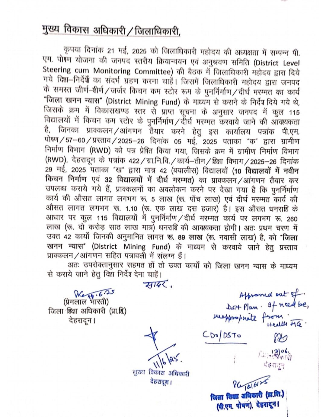 देहरादून : सरकारी स्कूलों की शिक्षा, स्वास्थ्य, सुविधा पर मुख्यमंत्री का विशेष फोकस है। जिलाधिकारी सविन बसंल ने सभी स्कूलों में मघ्याह्न भोजन की प्रोपर किचन बनाने के स्पष्ट निर्देश हैं। जिलाधिकारी ने जिले में किचन विहीन 42 विद्यालयों में किचन, स्टोररूम निर्माण एवं मरम्मत को प्रथम किस्त के रूप में जिला योजना विशेष फंड से 89 लाख धनराशि जारी की गई है। जिलाधिकारी ने जिले के प्रभारी मंत्री से जिला योजना विशेष फंड का प्राप्त किया अनुमोदन लेते हुए 2 हफ्ते में अपना कमिटमेंट पूर्ण करते हुए धनराशि जारी कर दी है। जिलाधिकारी के स्पष्ट निर्देश हैं कि स्कूली बच्चों एवं उनकी भोजन माताओं का स्वस्थ रहना आवश्यक है, स्कूलों में गुणवत्तायुक्त पौष्टिक मध्याह्न भोजन रहे तथा एल्यूमीनियम के बरतन में खाना बनता न दिखे इसके स्थान पर स्टील के बर्तन का उपयोग किया जाए। डीएम के पिछले माह समीक्षा बैठके दौरान किचन विहीन विद्यालयों की बात उजागर हुई थी, जिस पर डीएम ने त्वरित निर्देश देते हुए विशेष फंड हेतु पत्रावली चलाई थी।