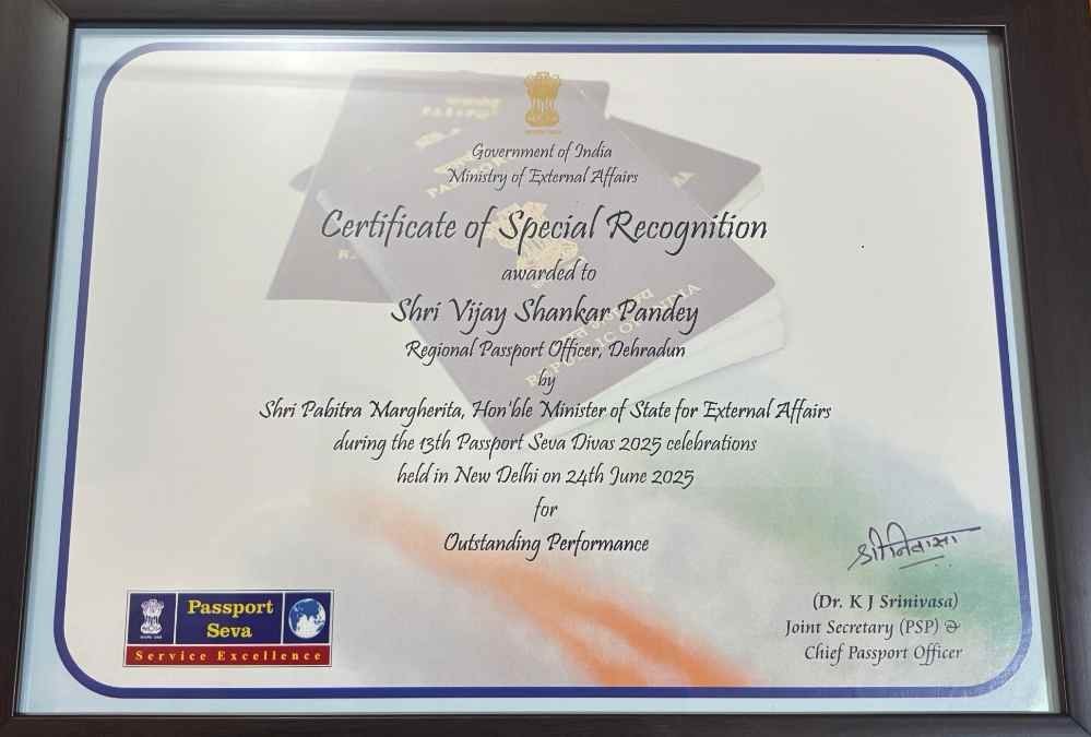 देहरादून: क्षेत्रीय पासपोर्ट अधिकारियों का सम्मेलन 23-25 जून, 2025 के दौरान नई दिल्ली में आयोजित किया गया। पासपोर्ट सेवा दिवस 24 जून, 2025 को मनाया गया। इस दिवस पर, विजय शंकर पांडेय को विदेश राज्य मंत्री पाबित्रा मार्गेरिटा द्वारा उत्कृष्ट प्रदर्शन के लिए विशेष मान्यता प्रमाण पत्र प्रदान किया गया। इस प्रकार उन्हें सालाना लगभग 1.5 लाख पासपोर्ट जारी करने वाले क्षेत्रीय पासपोर्ट कार्यालयों की श्रेणी में सर्वश्रेष्ठ पासपोर्ट अधिकारी का पुरस्कार दिया गया है।