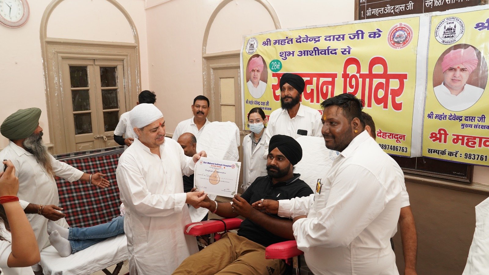 श्री गुरु राम राय जी महाराज को समर्पित स्वैच्छिक रक्तदान शिविर में संगत ने 105 यूनिट रक्तदान किया। श्री गुरु राम राय जी महाराज के महानिर्वाण पर्व पर महाकाल सेवा समिति द्वारा श्री महंत इन्दिरेश अस्पताल ब्लड बैंक के सहयोग से रक्तदान शिविर का आयोजन किया गया। रक्तदान शिविर में परम पूज्य श्रीमहंत देवेन्द्र दास जी महाराज ने दीप प्रज्जवलित कर शिविर का शुभारंभ किया। श्री महाराज जी ने रक्तदाताओं को स्मृति चिन्ह देकर सम्मानित किया और सभी को आर्शीवाद दिया। उन्होंने श्री महाकाल सेवा समिति द्वारा किये जा रहे रचनात्मक और सामाजिक कार्यों की भूरि-भूरि प्रशंसा की। शिविर में पुरूषों एवं महिलाओं ने उत्साहपूर्वक रक्तदान किया। इस दौरान प्रख्यात भागवताचार्य श्री सुभाष जोशी, श्री पृथ्वीनाथ सेवादल से संजय गर्ग, नवीन गुप्ता, विवेक मोहन श्रीवास्तव व महाकाल सेवा समिति के रौशन राणा, हेमराज अरोड़ा, विनय प्रजापति, आयुष जैन, गौरव जैन, बालकिशन शर्मा, संजीव गुप्ता, नितिन अग्रवाल, राहुल माटा, विक्रम चौधरी, कृतिका राणा, अनुष्का राणा आदि उपस्थित रहे। श्री महंत इन्दिरेश अस्पताल के ब्लड बैंक टीम का प्रतिनिधित्व अमित चन्द्रा व डॉ. सुप्रीत कौर ने किया।