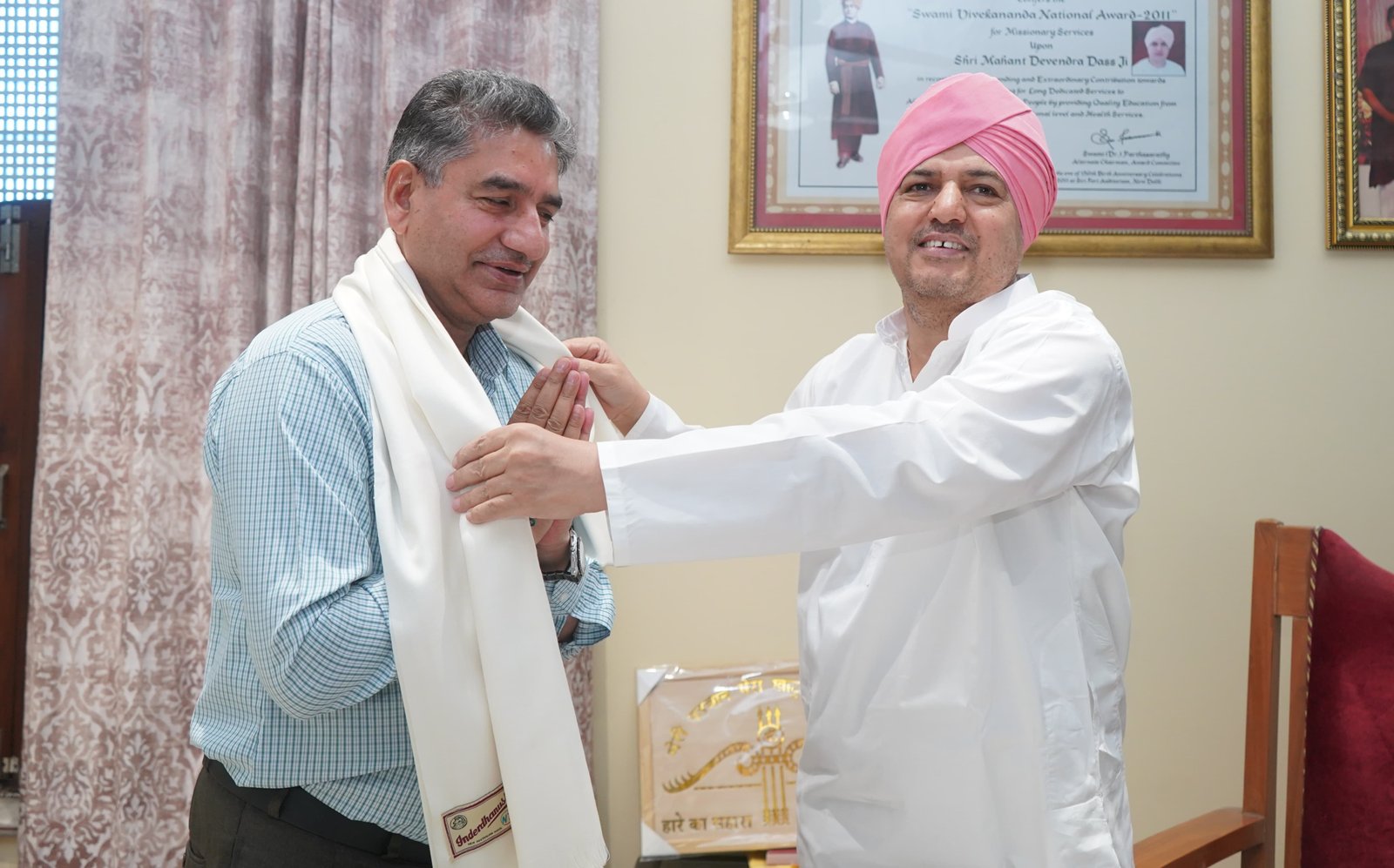 शनिवार को दीपक कुमार गैरोला- सचिव, संस्कृत शिक्षा, जनगणना एवं कार्यक्रम क्रियान्वयन, उत्तराखंड शासन ने श्री दरबार साहिब में माथा टेका। उन्होंने श्री दरबार साहिब के सज्जादे गद्दी नशीन एवं श्री गुरु राम राय विश्वविद्यालय के माननीय प्रेसीडेंट श्रीमहंत देवेन्द्र दास जी महाराज के साथ भेंट की व उनका आशीर्वाद प्राप्त किया। दोनों के मध्य कई महत्पूर्ण विषयों पर सार्थक चर्चा हुई. साथ ही साथ उन्हें उत्तराखंड सरकार के कार्यक्रम क्रियान्वयन विभाग द्वारा प्रकाशित मेरी योजना पुस्तकें भेंट कर सरकार की योजनाओं को श्री दरबार साहिब एवं श्री गुरु राम राय विश्वविद्यालय के माध्यम से भी प्रचारित- प्रसारित करने का अनुरोध किया।