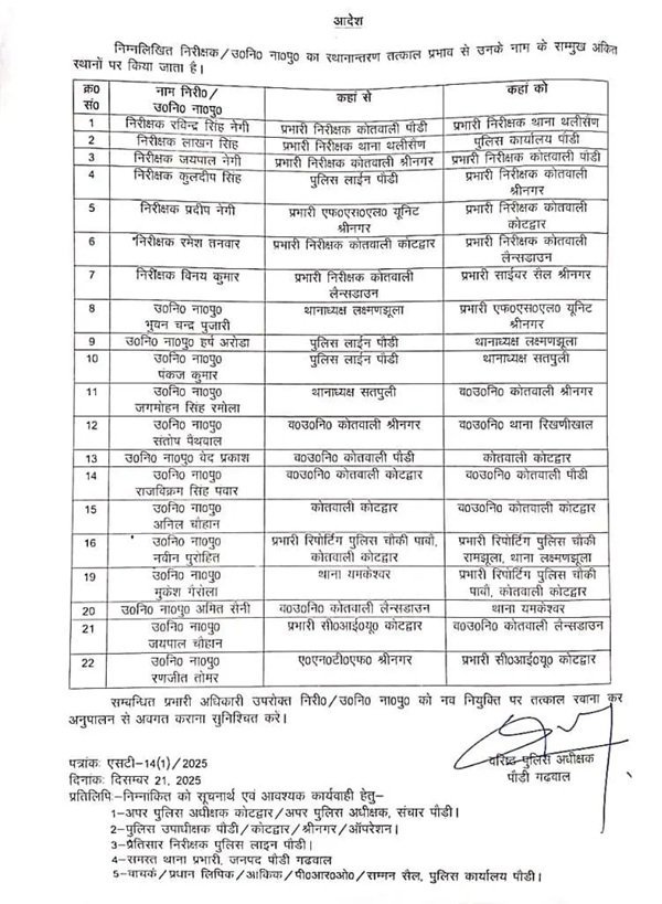 एसएसपी सर्वेश पंवार ने किया बड़ा प्रशासनिक फेरबदल, 47 पुलिसकर्मियों के तबादले, निरीक्षक प्रदीप नेगी होंगे कोटद्वार के नए कोतवाल, देखें सूचि