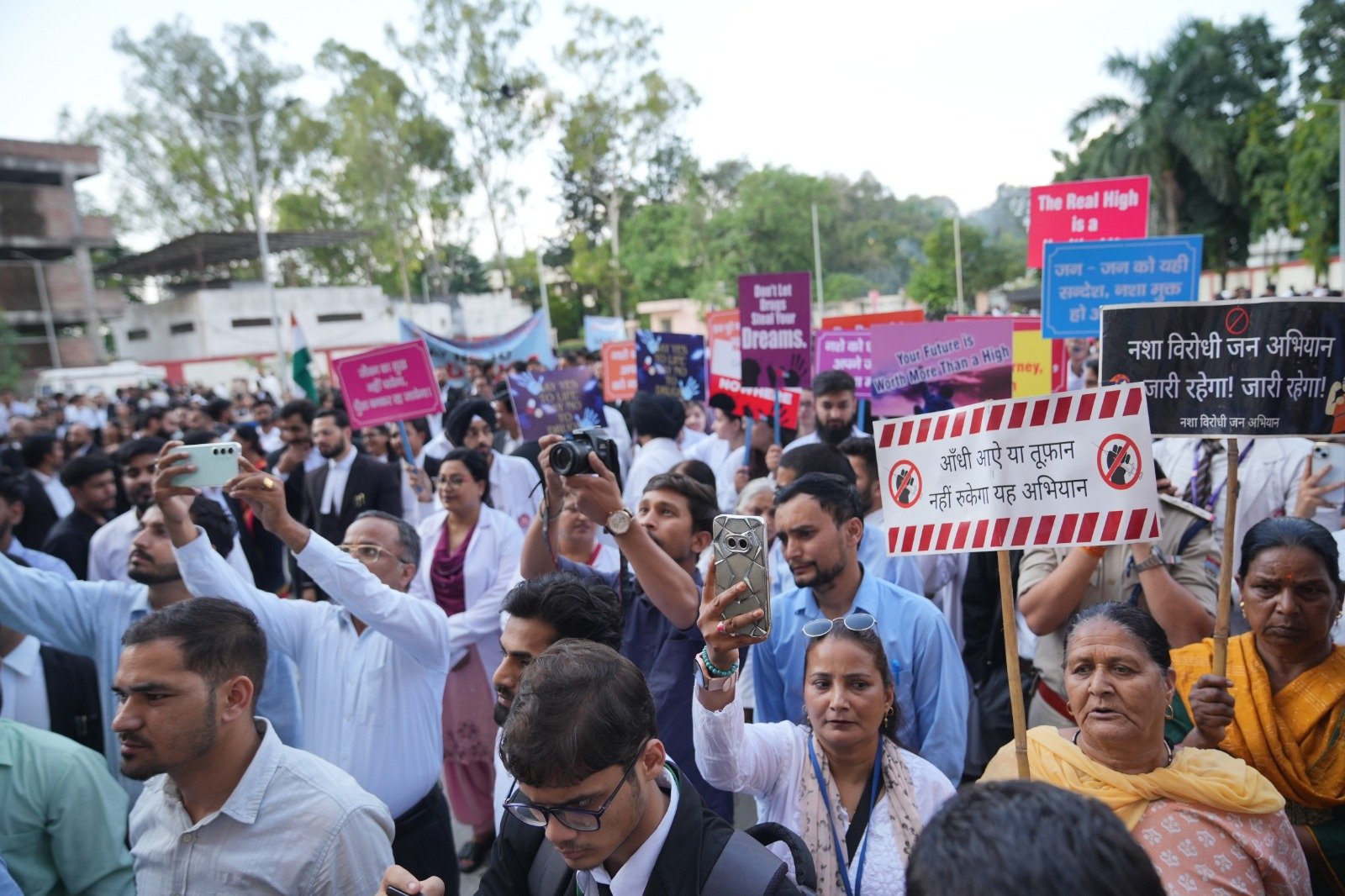 श्री गुरु राम राय विश्वविद्यालय के कुलसचिव डॉ. लोकेश गम्भीर ने कहा कि नशे के विरुद्ध इस जंग में युवाओं की भूमिका सबसे अहम है। यदि युवा जागरूक होकर नशे से दूरी बनाएं तो समाज स्वतः स्वस्थ और सशक्त हो जाएगा। जनजाागरूकता रैली जिला न्यायालय परिसर से प्रिंस चैक, राजा रोड़ पलटन बाज़ार, घंटाघर होते हुए गांधी चौक पर पहुंचकर सम्पन्न हुई। इस दौरान छात्र-छात्राओं ने हाथों पर लिखे संदेशों और नारों के माध्यम से लोगों को जागरूक किया। “नशा छोड़ो जीवन जोड़ो”, “नशा नहीं शिक्षा अपनाओ उज्ज्वल भविष्य बनाओ” और “जन-जन का एक ही नारा, नशा मुक्त हो देश हमारा” जैसे नारे लोगों को आकर्षित कर रहे थे। रैली में युवाओं का उत्साह देखने लायक था। एक सुर में सबने कहा “नशे को कहें ना” और समाज को नशा मुक्त बनाने का संकल्प लिया।