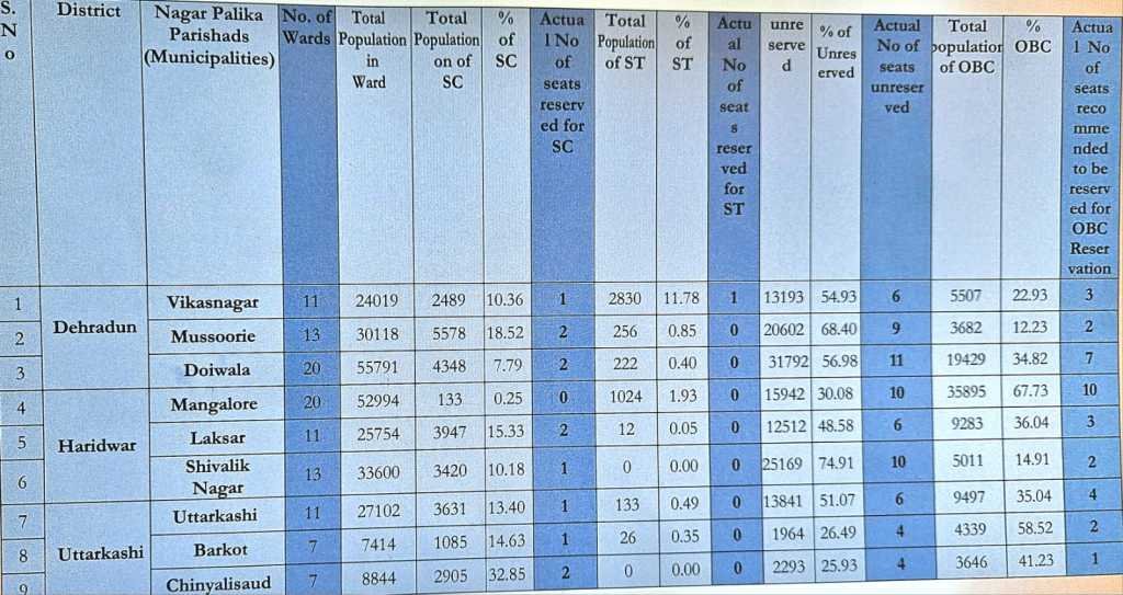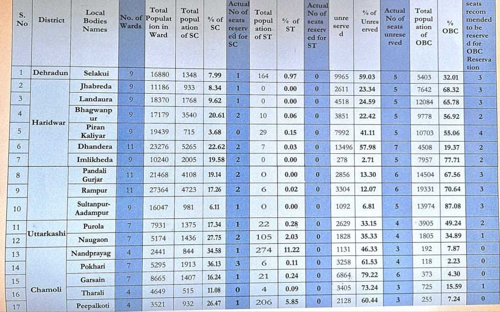 देहरादून: एकल सदस्यीय समर्पित आयोग के अध्यक्ष बी एस वर्मा ने प्रदेश भर के नगर निकायों का सर्वे पूरा कर शासन को अपनी रिपोर्ट सौंप दी है व शासन ने भी इस रिपोर्ट को स्वीकार कर लिया है। रिपोर्ट की माने तो आगामी नगर निकाय चुनाव अब नए तय किये गए आरक्षण के अनुसार होगा।