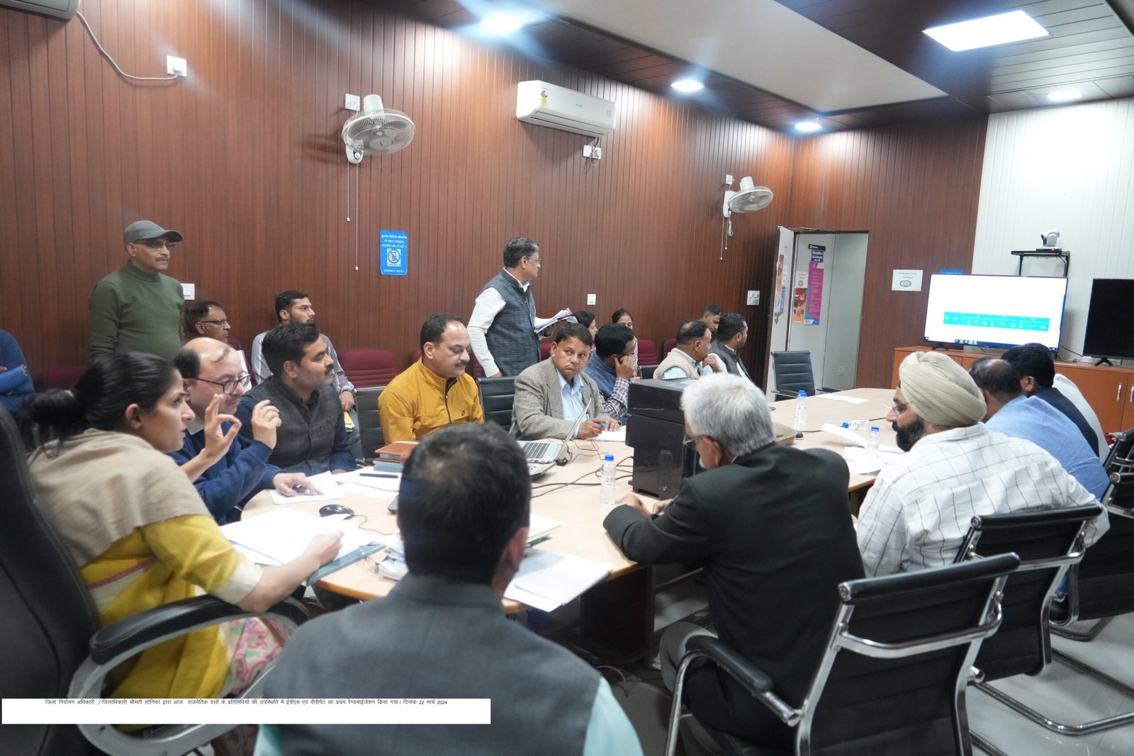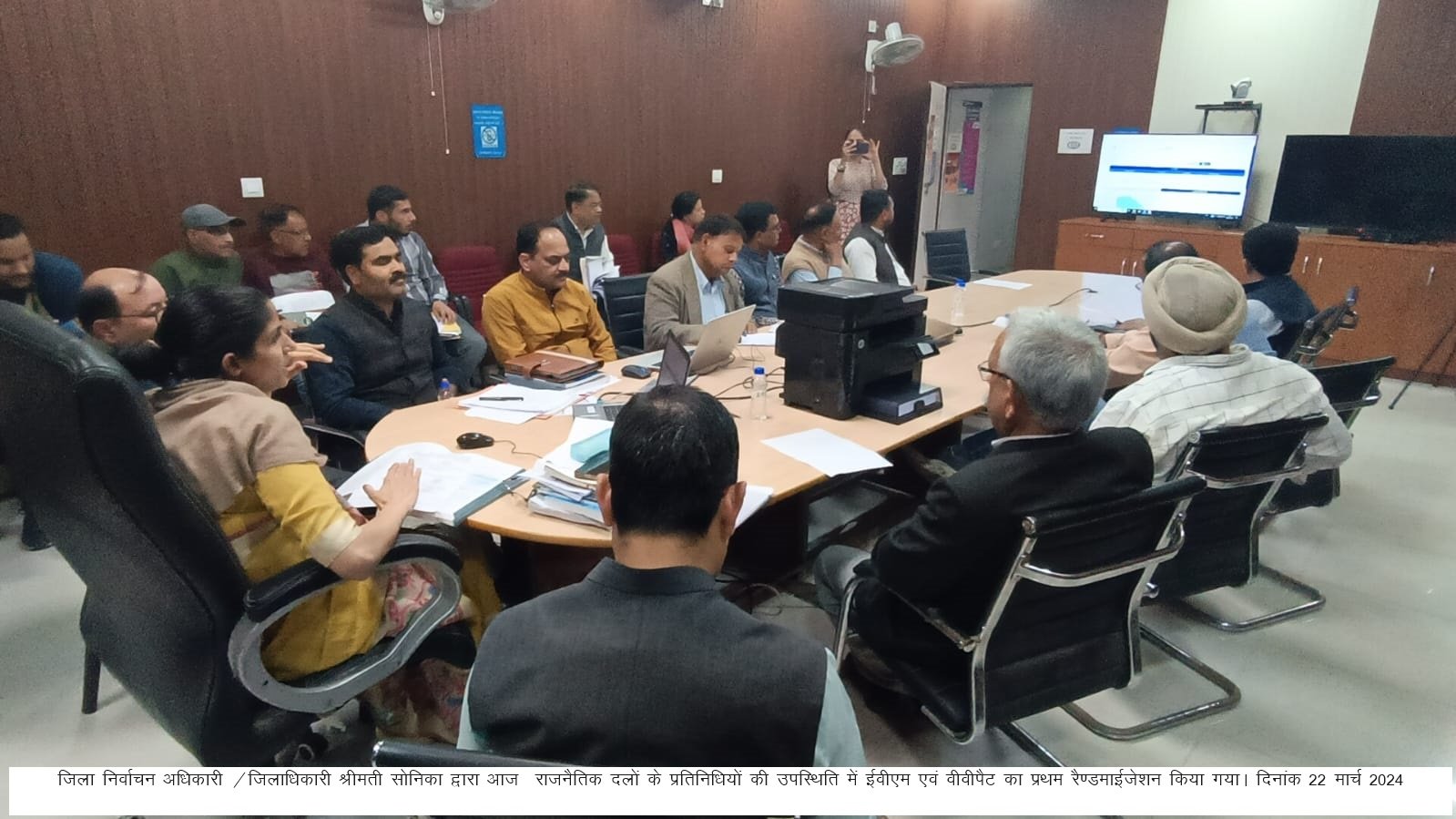 देहरादून : रिटर्निंग अधिकारी-01 टिहरी गढवाल संसदीय क्षेत्र/जिला निर्वाचन अधिकारी देहरादून/जिलाधिकारी सोनिका की अध्यक्षता में एनआईसी सभागार में लोकसभा सामान्य निर्वाचन-2024 के सम्पादनार्थ ईवीएम/वीवीपैट मशीनों का प्रथम रैण्डमाईजेशन राजनैतिक दलों के प्रतिनिधियों की उपस्थिति में किया गया। प्रथम रैण्डमाईजेशन में 5791 बीयू, 4109 सीयू तथा 3276 वीपीपैट का रैण्डमाईजेशन किया गया।  इस अवसर पर  भाजपा से अरविन्द जैन, कांग्रेस से डॉ जसविन्दर सिंह व शहजाद अंसारी, सीपीआई(एम) से अनन्त आकाश, आप से चौ. रविन्द्र कुमार, बसपा से दिगविजय सिंह,  अपर जिलाधिकारी प्रशासन जयभारत सिंह, अपर जिलाधिकारी वित्त एवं राजस्व रामजीशरण शर्मा,  सहित समस्त एआरओ उपस्थित रहे।