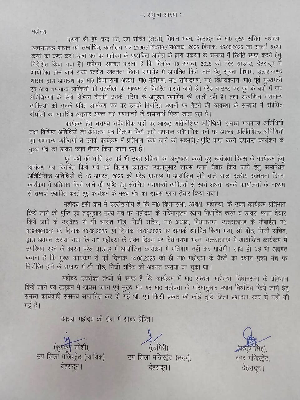 जिला प्रशासन की संयुक्त आख्या में बताया है कि विधानसभा, अध्यक्ष, के उक्त कार्यक्रम प्रतिभाग किये जाने की पुष्टि एवं तद्नुसार मुख्य मंच पर उनके गरिमानुरूप स्थान निर्धारित करने व डायस प्लान तैयार किये जाने के उद्देश्य से चन्द्रेश गौड़, निजी सचिव, अध्यक्ष, विधानसभा, उत्तराखण्ड के मोबाईल नं० 8191901048 पर 13 अगस्त 2025 एवं 14 अगस्त 2025 को सम्पर्क स्थापित किया गया, आख्या में उल्लेख किया गया है कि श्री गौड, निजी सचिव, द्वारा अवगत कराया गया कि विधानसभा अध्यक्ष के उक्त दिवस पर विधानसभा भवन, उत्तराखण्ड में आयोजित कार्यक्रम में उपस्थित रहने के कारण परेड ग्राउण्ड में आयोजित कार्यक्रम में प्रतिभाग नहीं कर पायेंगी।