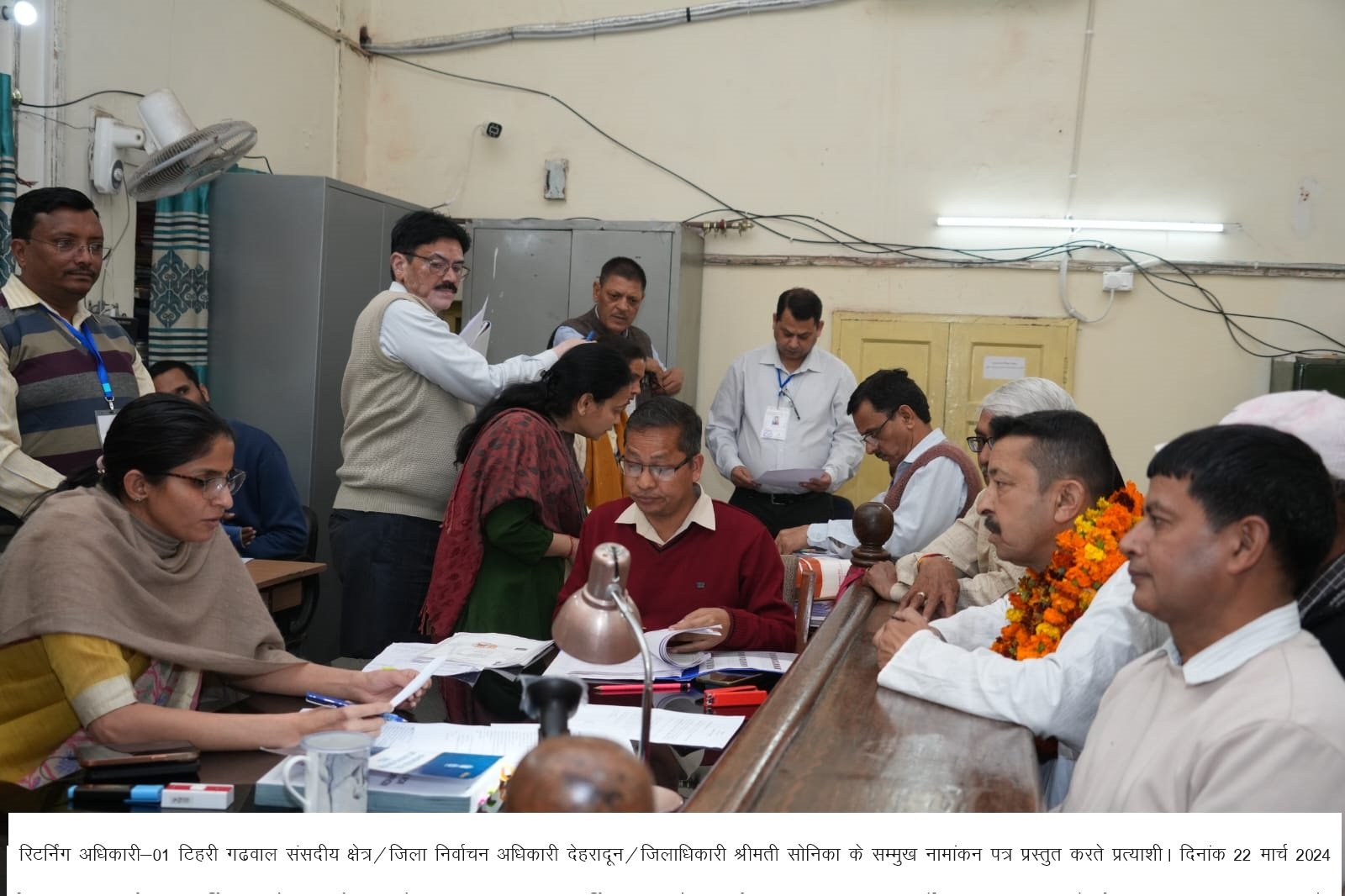 रिटर्निंग अधिकारी-01 टिहरी गढवाल संसदीय क्षेत्र/जिला निर्वाचन अधिकारी देहरादून सोनिका ने अवगत कराया कि आज नाम निर्देशन कि प्रक्रिया प्रारम्भ हो गई है। नाम निर्देशन के लिए 27 मार्च 2024 तक   (अवकाश को छोड़कर) प्रातः 11 बजे अपराह्न 03 बजे तक कोई भी आकर अपना नामांकन भर सकता है। उन्होंने कहा कि धारा 144 प्रभावी है, आयोग की गाईडलाईन के अनुसार प्रत्याशी की ओर से  प्रत्याशी सहित कुल 05 व्यक्ति नामांकन कक्ष में प्रवेश कर सकते हैं।