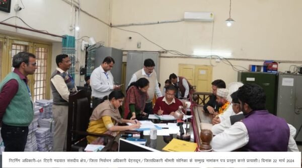 देहरादून : लोकसभा सामान्य निर्वाचन-2024 को निष्पक्ष एवं निर्विघ्न सम्पन्न कराने हेतु  नामांकन प्रक्रिया में  जिलाधिकारी कार्यालय परिसर में जिलाधिकारी कोर्ट कक्ष /नामांकन कक्ष में रिटर्निंग अधिकारी-01 टिहरी गढवाल संसदीय क्षेत्र/जिला निर्वाचन अधिकारी देहरादून/जिलाधिकारी सोनिका को दो प्रत्याशियों ने अपना  नामांकन पत्र प्रस्तुत करते हुए टिहरी गढवाल संसदीय क्षेत्र से नामांकन किया तथा 6 नामांकन पत्र प्रत्याशी /प्रतिनिधियों द्वारा प्राप्त लिए गए।  अब तक 13 प्रत्याशियों द्वारा 18 नांमाकन पत्र प्राप्त किये गए हैं।