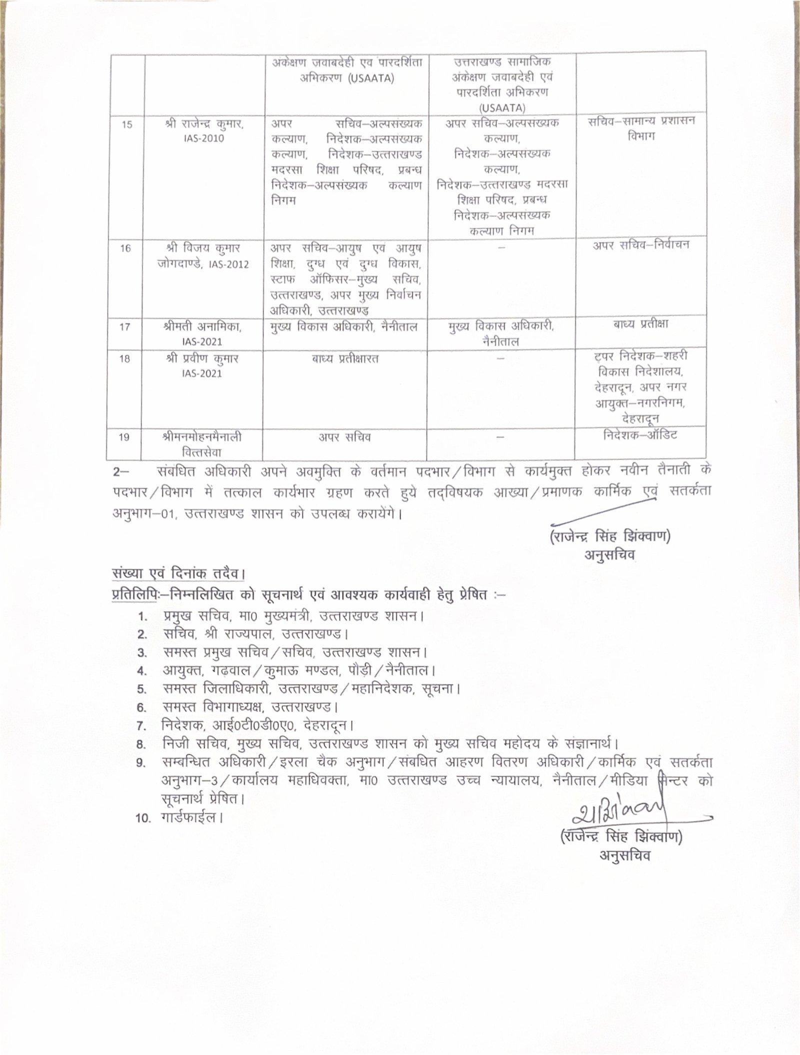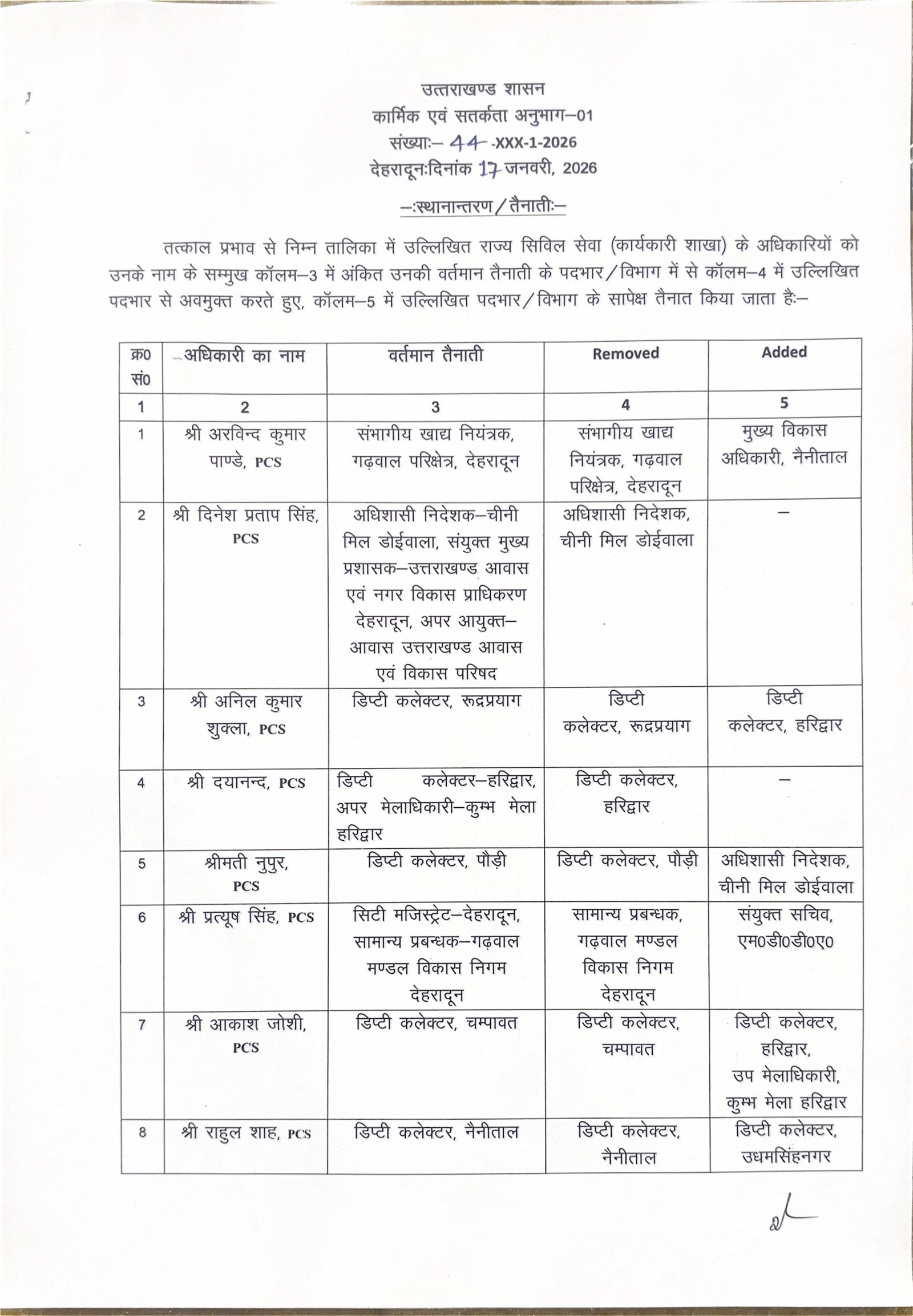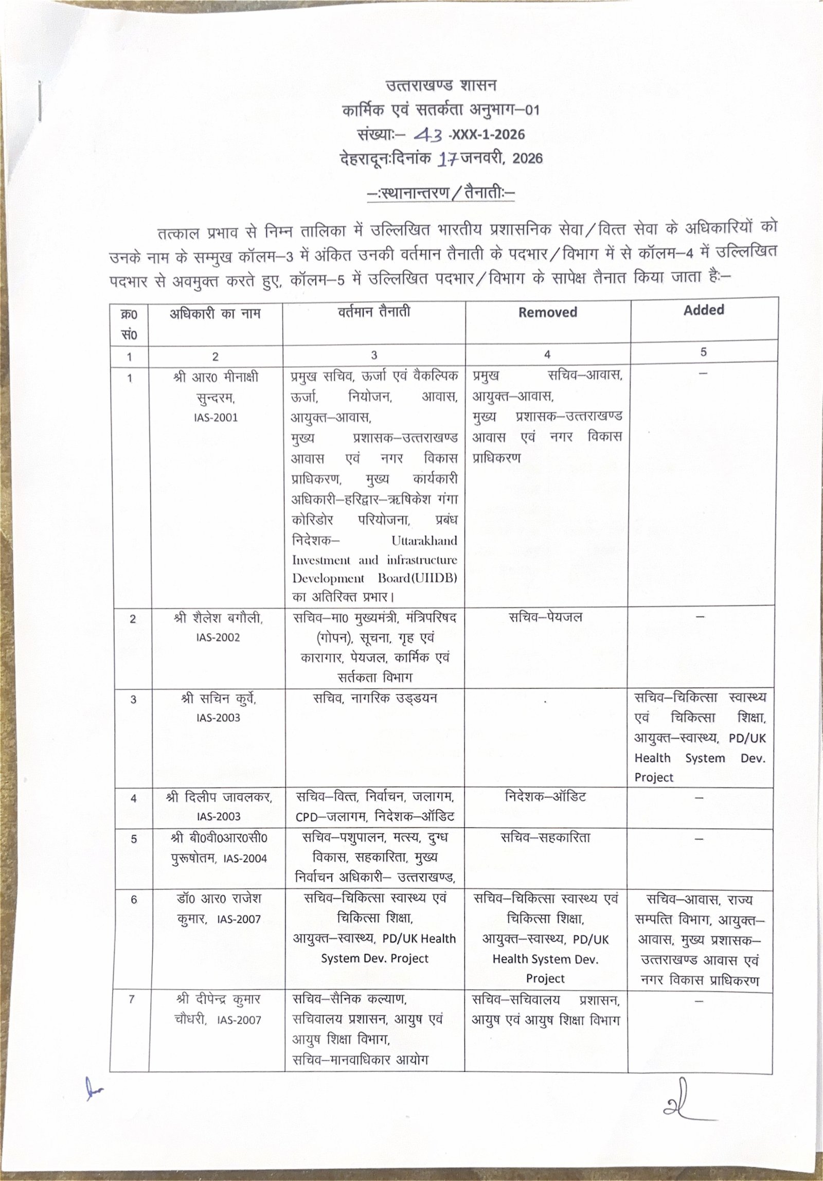 उत्तराखंड शासन ने किए IAS और PCS अधिकारियों के ट्रांसफर, देखें सूचि by January 18, 2026 written by January 18, 2026 Share 0FacebookTwitterPinterestWhatsappदेहरादून : उत्तराखंड शासन ने किए IAS और PCS अधिकारियों के ट्रांसफर, देखें सूचि Share 0 FacebookTwitterPinterestWhatsapp