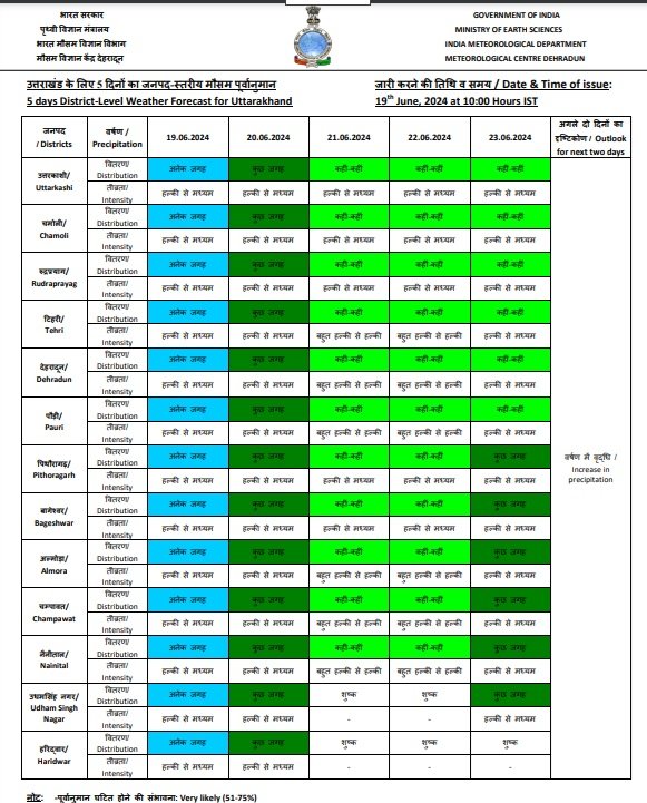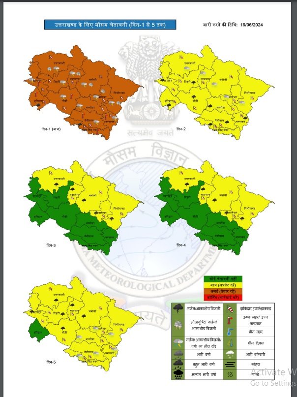 इस बीच मौसम विभाग ने अगले पांच दिनों के लिए अलर्ट जारी किया है। इसके अनुसार राज्य के सभी जिलों में बारिश हो सकती है। खासकर आज 19 जून के लिए ऑरेंज अलर्ट जारी किया गया है। हालांकि, अब तक मैदानी जिलों में बारिश के आसार कम ही नजर आ रहे हैं।