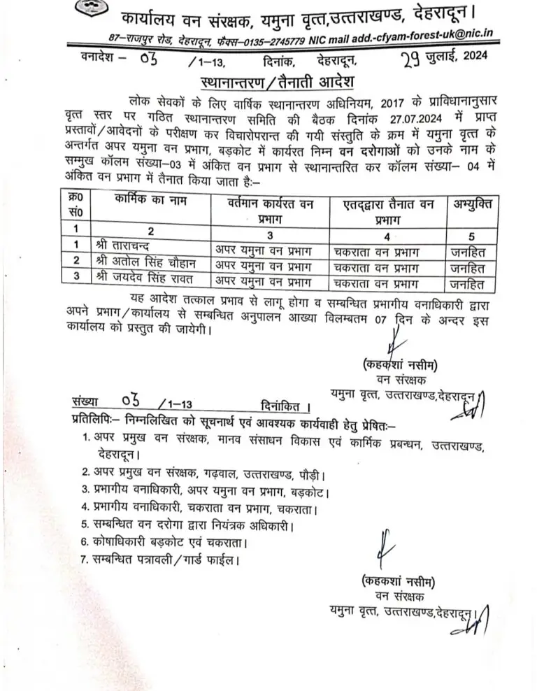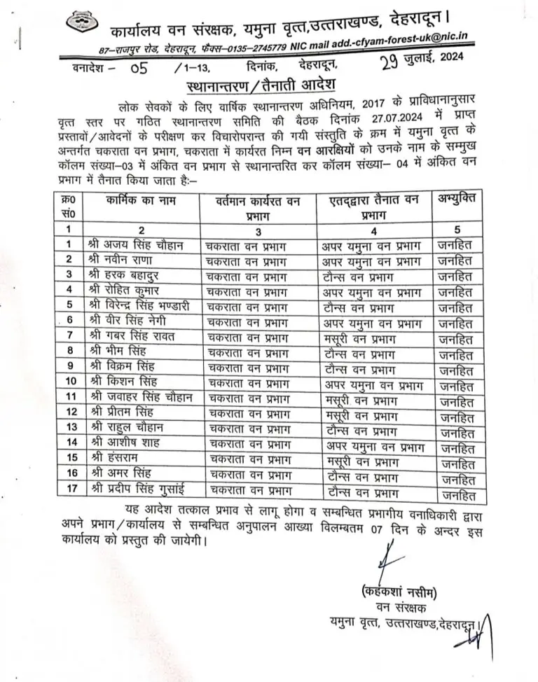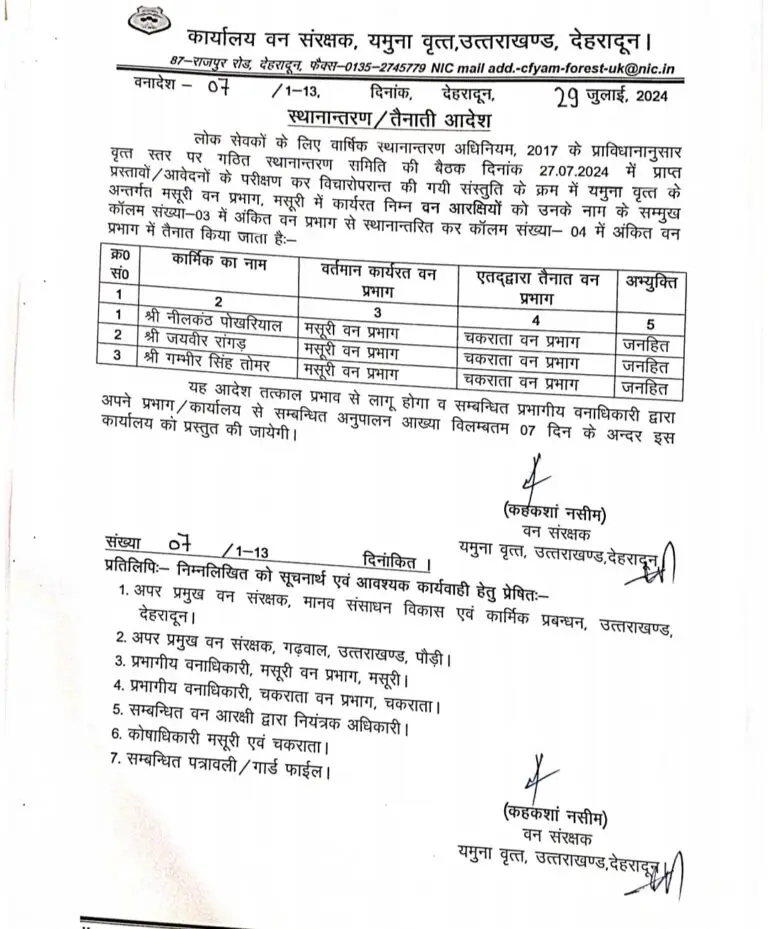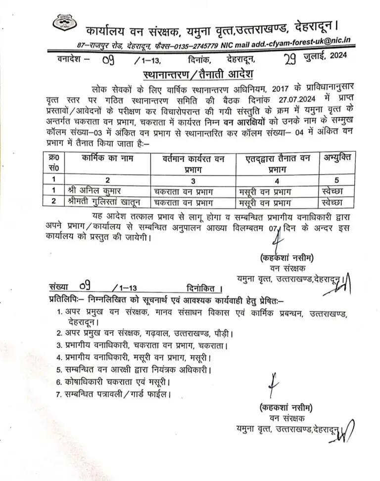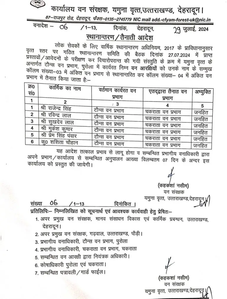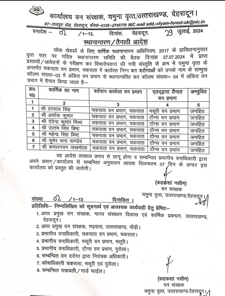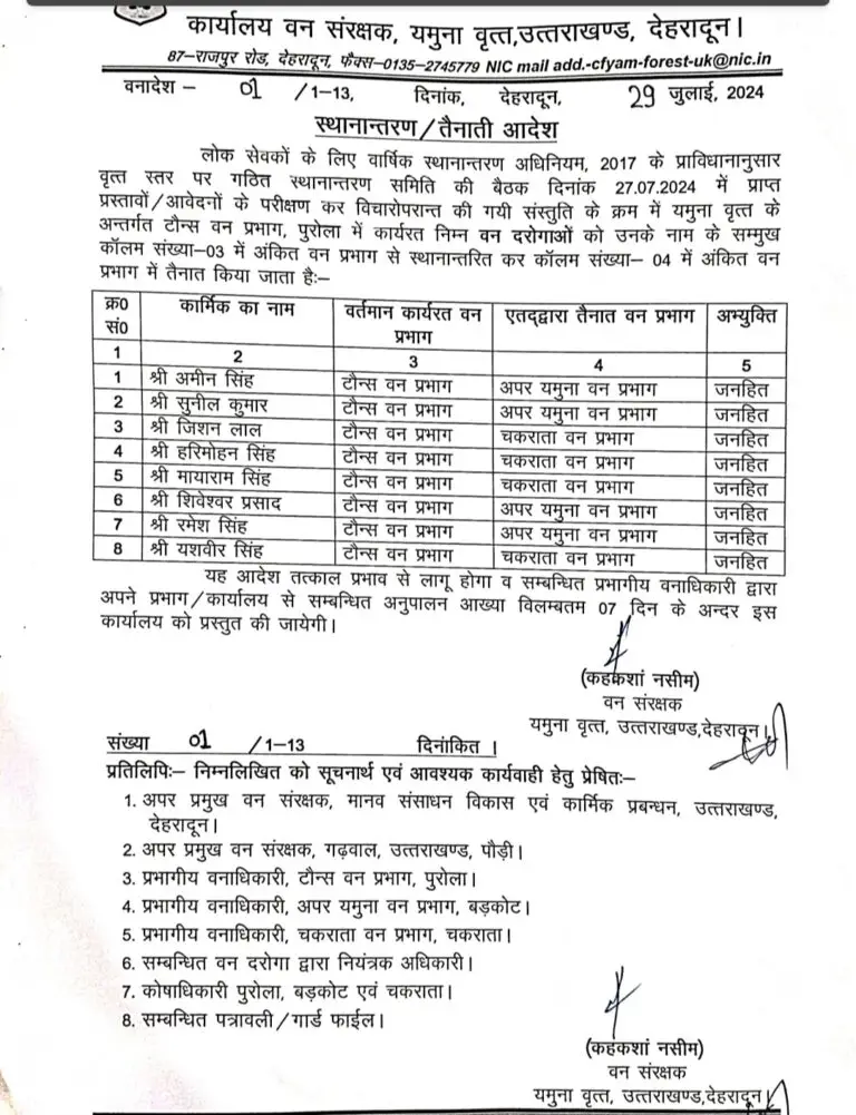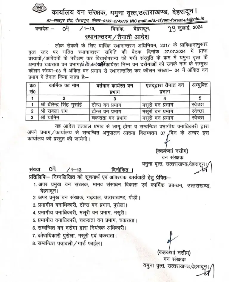 Home » Blog » वन विभाग में यमुना वृत के कई वन दरोगाओं और आरक्षियों के स्थानान्तरण, देखें सूचि