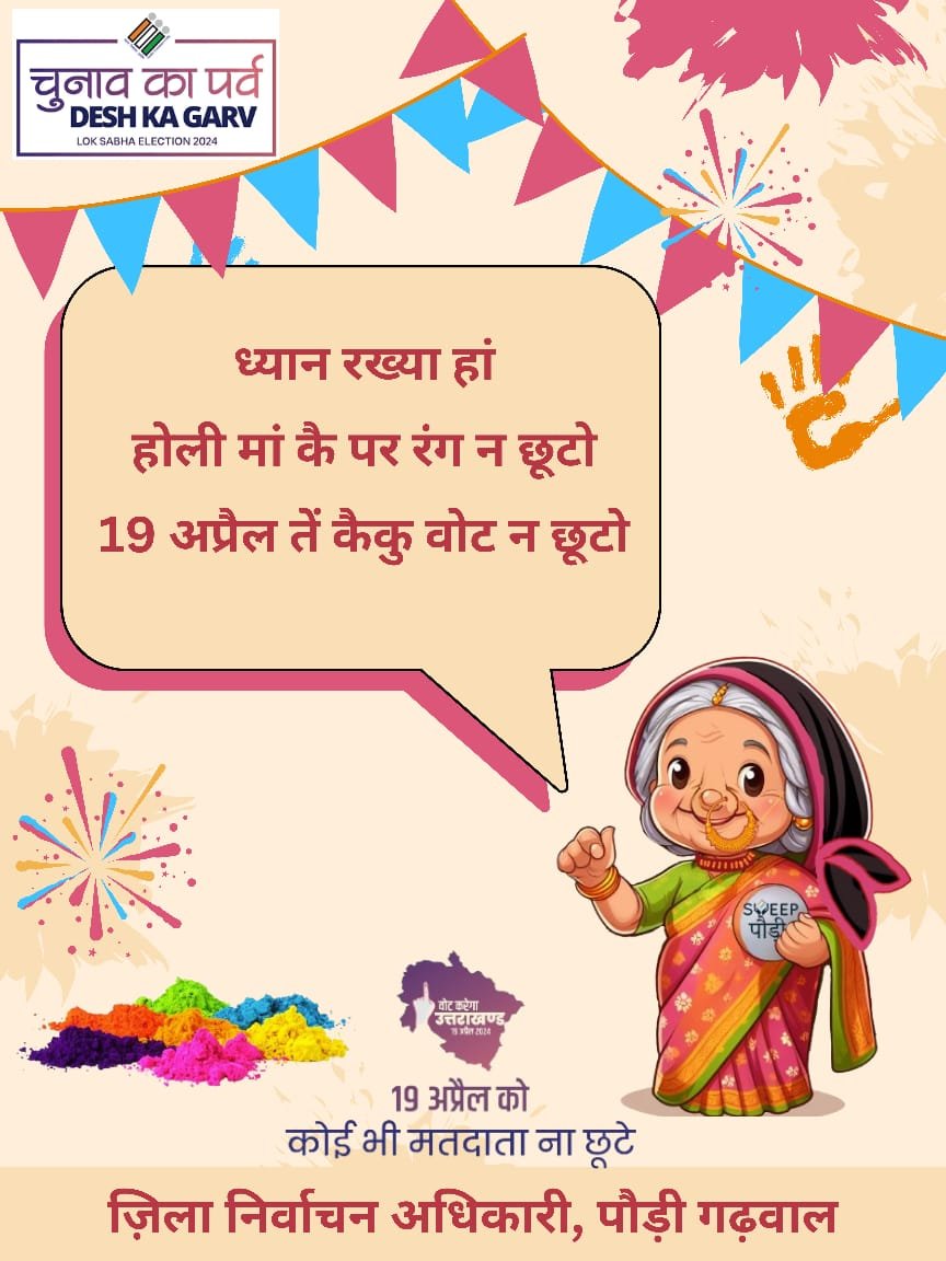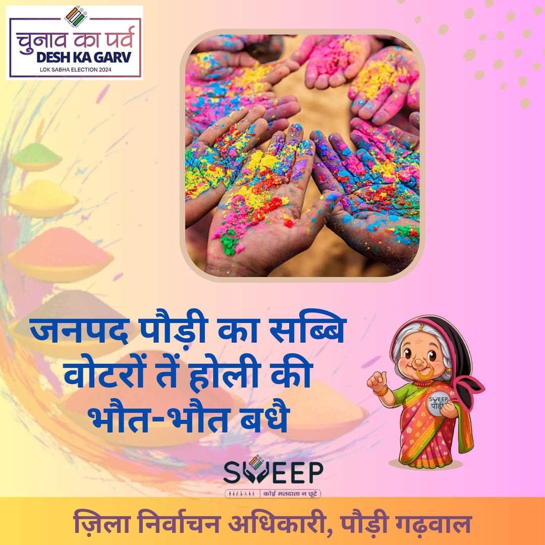 पौड़ी : लोकसभा सामान्य निर्वाचन-2024 में शत-प्रतिशत मतदाताओं को मतदान हेतु प्रेरित करने के लिए मतदाता जागरूकता गतिविधियों (स्वीप) के तहत विभिन्न कार्यक्रय आयोजित किये जा रहे हैं। जनपद पौड़ी गढ़वाल द्वारा मतदाताओं को जागरूक करके उन्हें मतदान के लिए प्रेरित करने के उद्देश्य से लोकसभा सामान्य निर्वाचन हेतु इलैक्शन मैस्कॉट ‘‘पौड़ी की बौडी’’ तैयार कर उसके माध्यम से विभिन्न प्रकार के मतदाता जागरूकता संदेश व एनीमेटेड वीडियो तैयार कर जनपद के विभिन्न सोशल मीडिया के माध्यम से प्रचार-प्रसार किया जा रहा है।