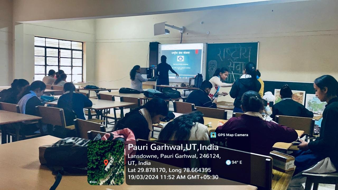 जयहरीखाल : भक्त दर्शन राजकीय स्नातकोत्तर महाविद्यालय जयहरीखाल की राष्ट्रीय सेवा योजना इकाई के तत्वावधान में ‘बेस्ट आउट ऑफ वेस्ट’ विषय पर कार्यशाला का आयोजन किया गया। कार्यशाला में अनुपयोगी वस्तुओं जैसे अख़बार, प्लास्टिक तथा कांच की बोतलों, चीड के पिरूल, आइसक्रीम स्टिक आदि का उपयोग कर छात्र-छात्राओं को पेन स्टैण्ड, फ़ोटो फ्रेम, फ्लावर पॉट, विंडचाइम, टोकरी आदि सजावटी सामान बनाना सिखा । कार्यशाला में डॉ.विनीता, डॉ. वन्दना तथा डॉ. नीना ने स्टोन आर्ट से परिचित करवाया । डॉ. नेहा शर्मा ने कार्डबोर्ड के माध्यम से विभिन्न प्रकार की कलाकृतियाँ बनाना सिखाया तथा डॉ. शिप्रा शर्मा ने अखबार के प्रयोग की विधियों से परिचित करवाया । महाविद्यालय की प्राचार्या प्रो.लवनीरानी राजवंशी ने छात्र- छात्राओं द्वारा बनाये गए उपयोगी वस्तुओं की प्रशंसा की तथा इस प्रकार की कार्यशालाओं की उपयोगिता बतायी । कार्यक्रम के अन्त में प्रतिभाग करने वाले स्वयंसेवकों को पुरुष्कृत किया गया । कार्यशाला में महाविद्यालय के सभी प्राध्यापक उपस्थित रहे l कार्यक्रम का संचालन एनएसएस कार्यक्रम अधिकारी डॉ. अर्चना नौटियाल द्वारा किया गया ।